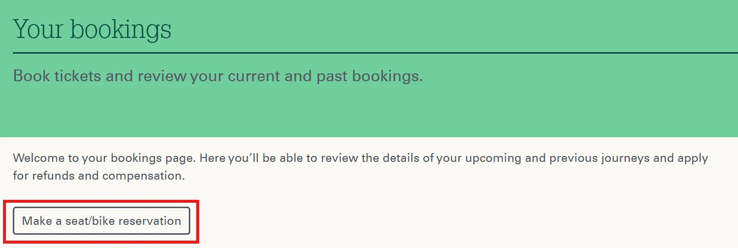 Um einen Sitzplatz zu reservieren, muss ein Nutzerkonto angelegt werden. Nach erfolgreicher Anmeldung kann im Menü im Bereich Bookings über den Button Make a seat/bike reservation eine Verbindung ausgesucht und reserviert werden. Bei der Ticketauswahl lässt sich ein beliebiges Ticket entsprechend der gewünschten Klasse wählen.