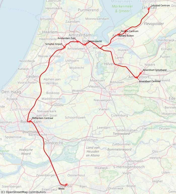 Teilweise zuschlagspflichtiger Schnellzug zwischen Lelystad oder Amersfoort, Amsterdam Zuid, Schiphol Airport, Rotterdam Centraal und Breda.